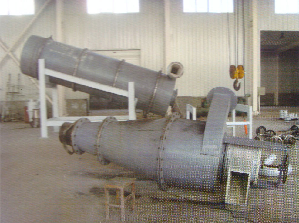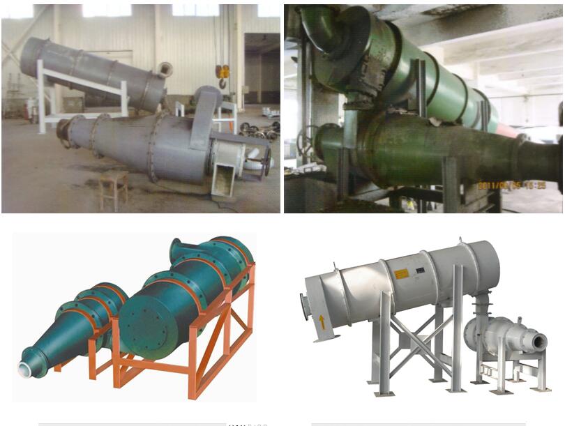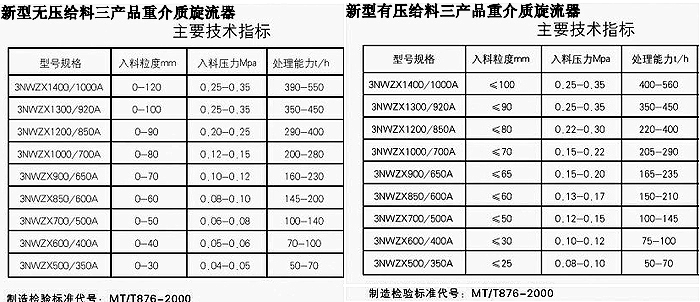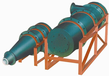 三产品重介质旋流器是由一台圆筒型旋流器和一台圆筒/圆锥型旋流器串联而成的机组。被选物料在离心力与密度场作用下,首先从一段圆筒型旋流器中分离出轻产物(精煤),而部分高密度悬浮液与重产物(中煤和矸石)经连接管进入二段(再选)旋流器,将中煤和矸石分离。